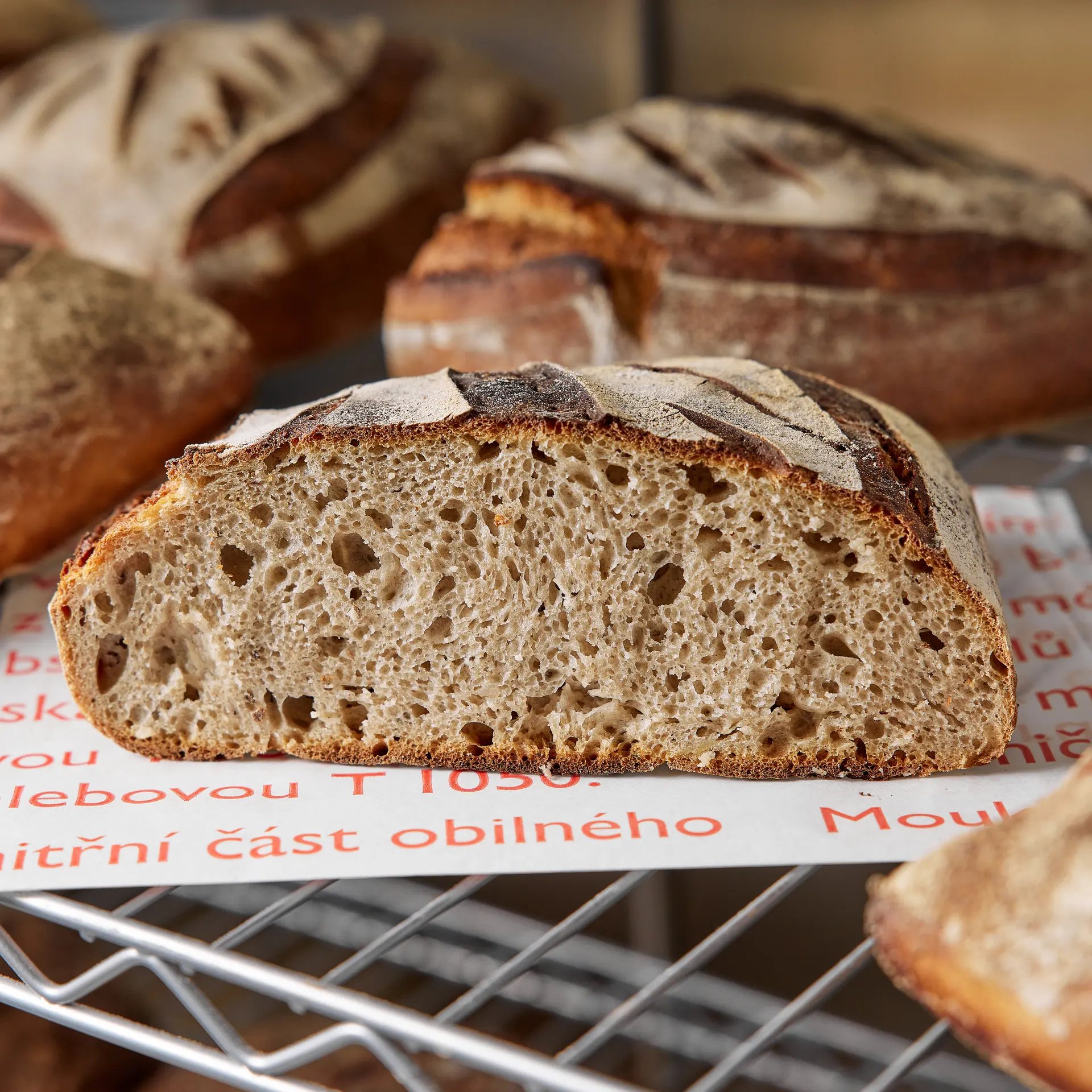 This bread with 66% rye flour has a crispy and floury crust with slices. The dense crumb with small eyes tastes and smells of caraway seeds. In Eska we like to spread fresh butter on it, but it is also good for thickening sauces or bread soup. Ingredients: 33 % domestic rye BIO flour, 33 % domestic rye BIO bread flour, 33 % domestic wheat BIO bread flour, Czech roasted cumin, salt. We only bake the 66 on Fridays and it is available until sold out.